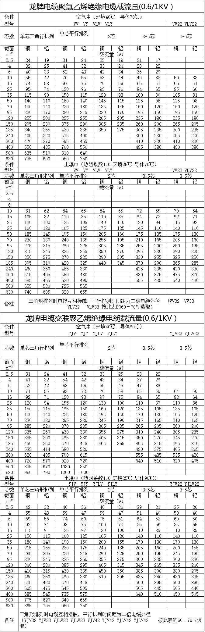 以上數(shù)據(jù)只適用于延長牌國標(biāo)電纜,僅供參考,請以專業(yè)計(jì)算為準(zhǔn)。